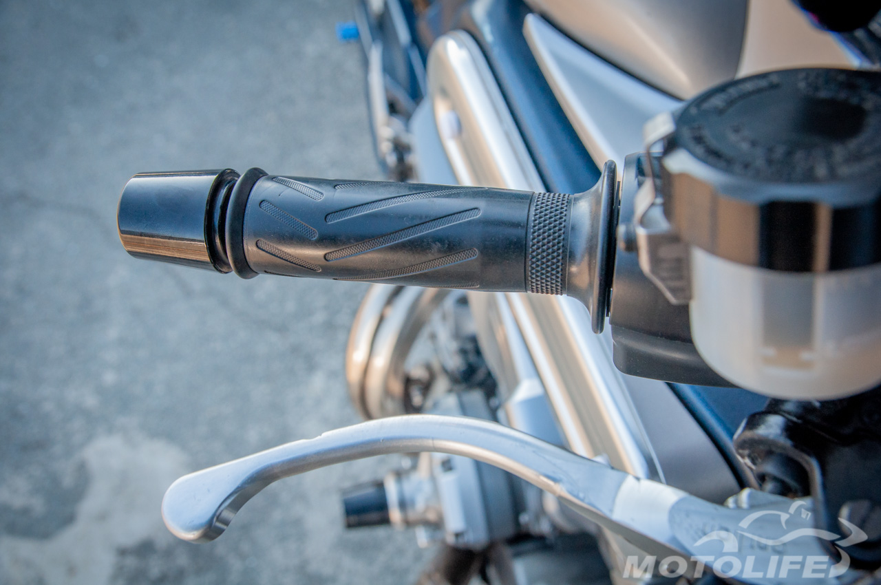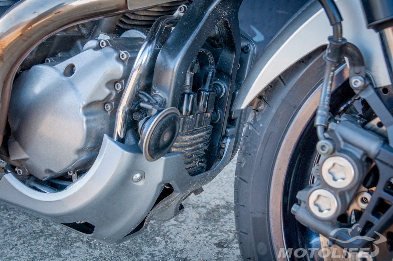 Главной особенностью Yamaha MT-01 является 2-цилиндровый V-образный двигатель воздушного охлаждения, объемом 1670 куб.см., выдающий 90 л.с. мощности и 150 Нм крутящего момента.